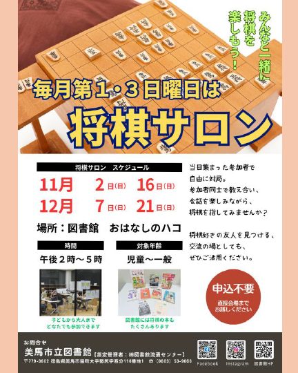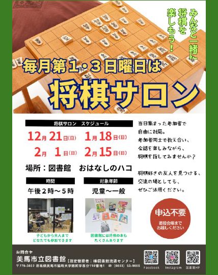 【みましりつとしょかん将棋サロン】 美馬市立図書館では、毎月第1・3日曜日に、将棋サロンを開催しています。 当日集まった参加者で自由に対局。参加者同士で教え合い、会話を楽しみながら、将棋を指してみませんか? 将棋好きの友人を見つける、交流の場としても、ぜひご活用ください。 時間:午後2時~5時 場所:美馬市立図書館 対象:小学生~一般 定員:4組8名(人数によっては時間を決め、入れ替え制にします) 参加費:無料 ※申込不要。直接会場までお越しください。 お問い合わせ・申し込み先:美馬市立図書館 TEL 0883-53-9666