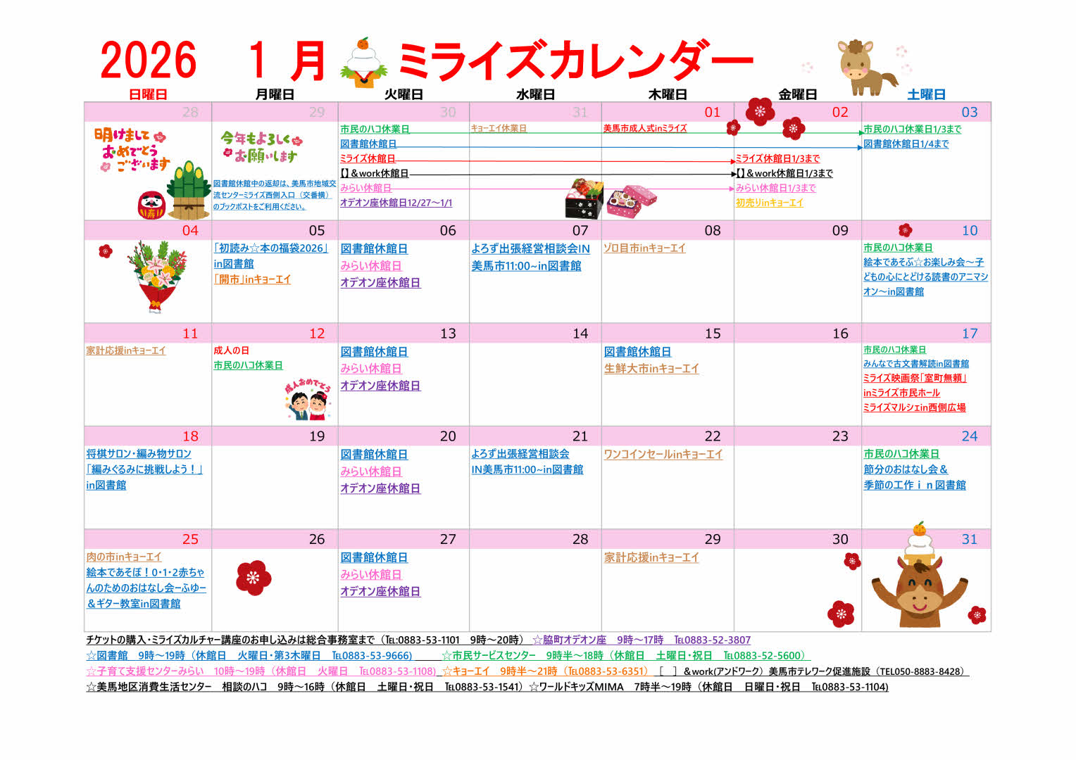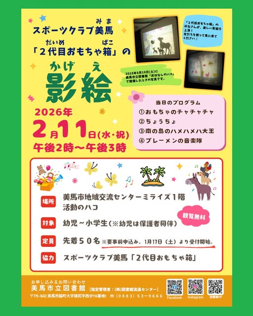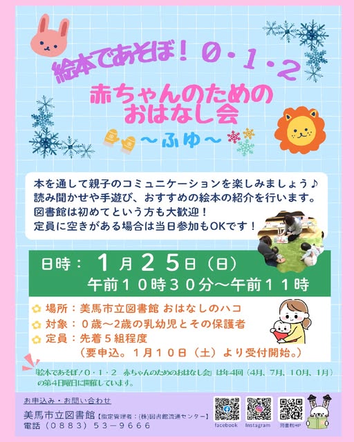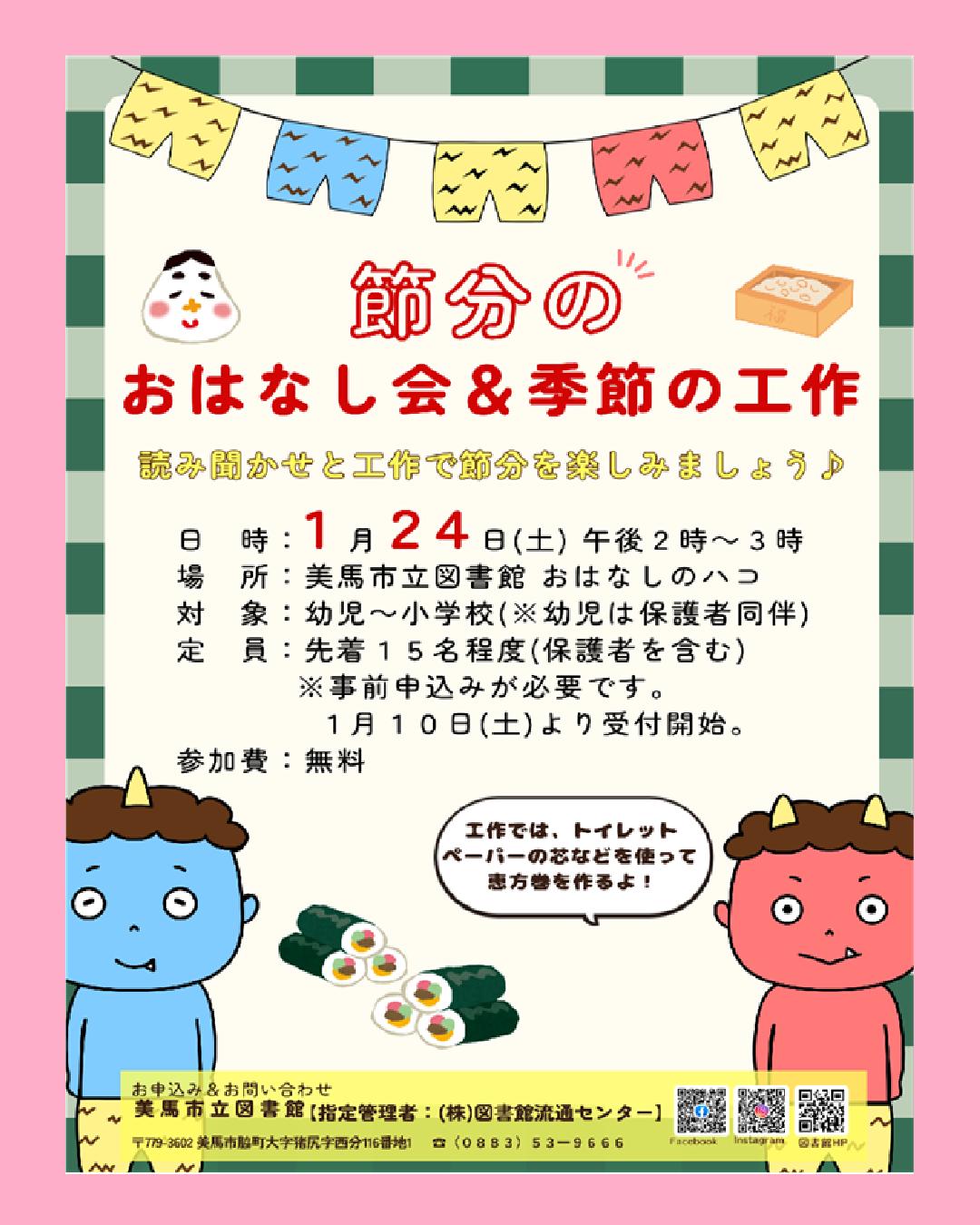おには~そと!ふくは~うち!美馬市立図書館では、今年も人気の恒例イベント「節分のおはなし会&季節の工作」を開催します!読み聞かせと工作で節分を楽しみましょう!!親子そろってご参加ください♪日 時:1月24日(土)午後2時~午後3時場 所:美馬市立図書館 おはなしのハコ対 象:幼児~小学生(※幼児は保護者同伴)定 員:各回先着15名(※保護者を含む)参加費:無料※事前申込みが必要です。1月10日(土)より受付開始します。美馬市立図書館カウンター、またはお電話にてお申込みください。◇お問い合わせ・お申し込み先:美馬市立図書館【指定管理者:(株)図書館流通センター】 TEL(0883)53-9666