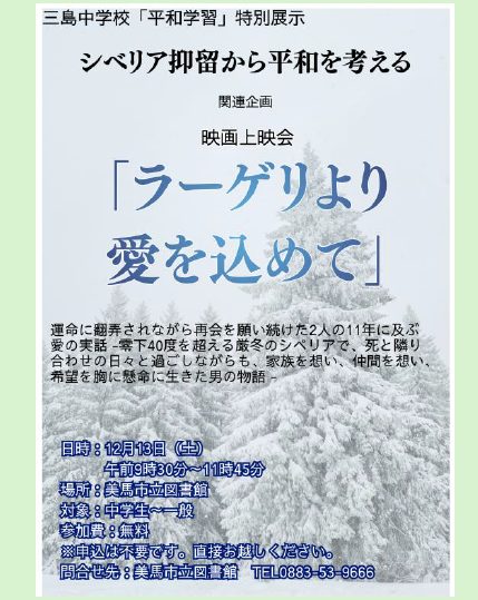 三島中学校「平和学習」特別展示『シベリア抑留から平和を考える』関連企画として、映画「ラーゲリより愛を込めて」を上映します♪